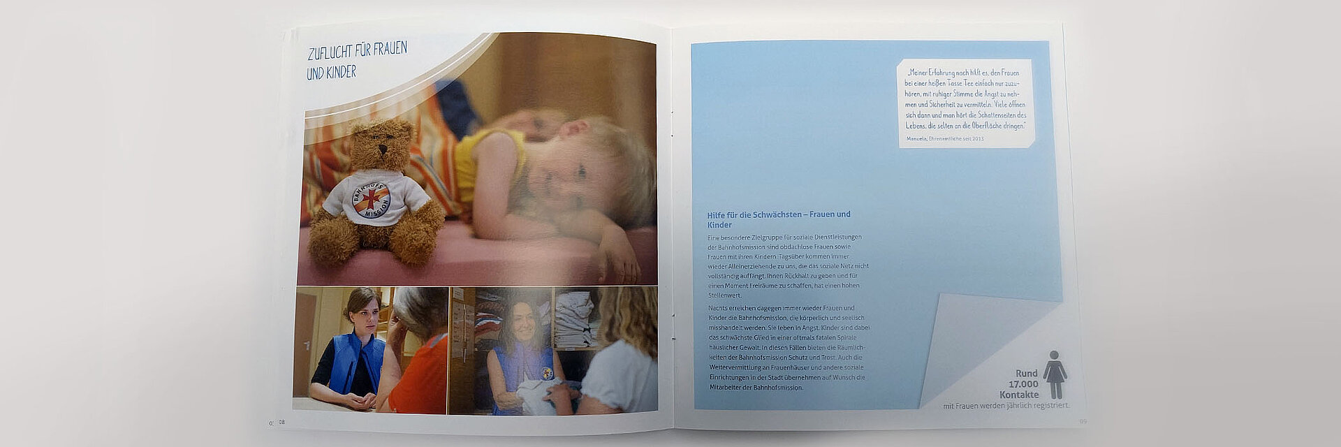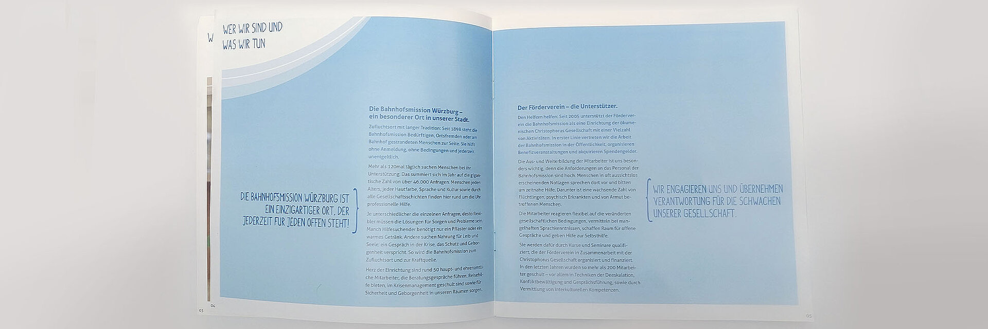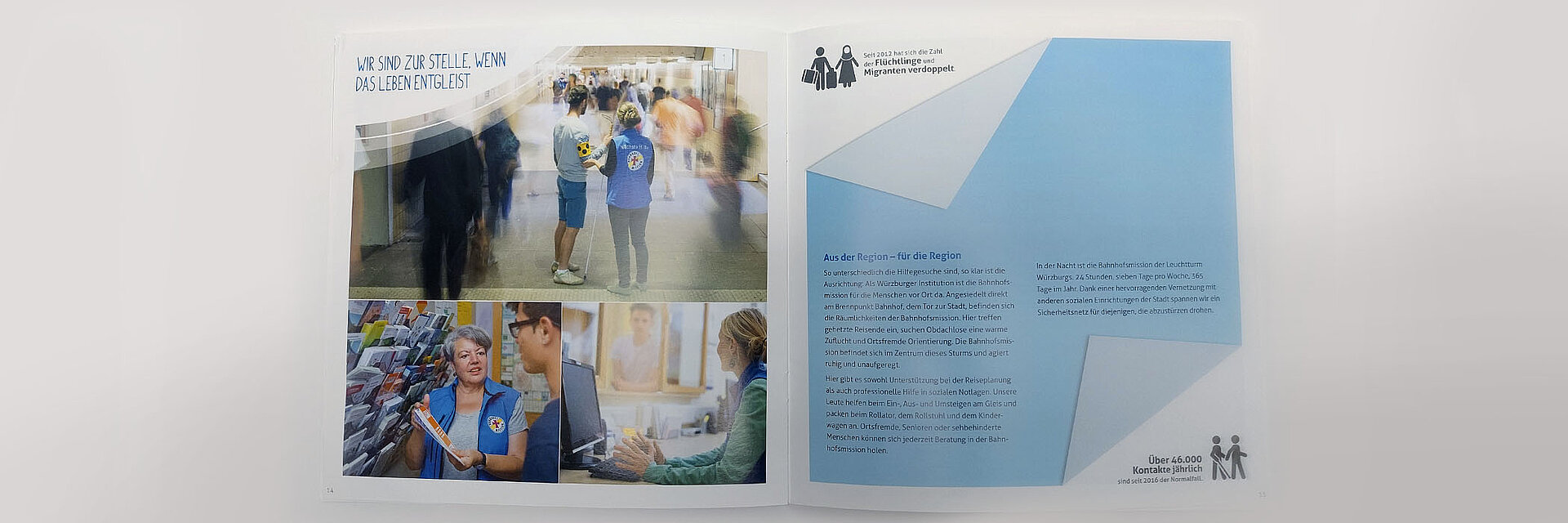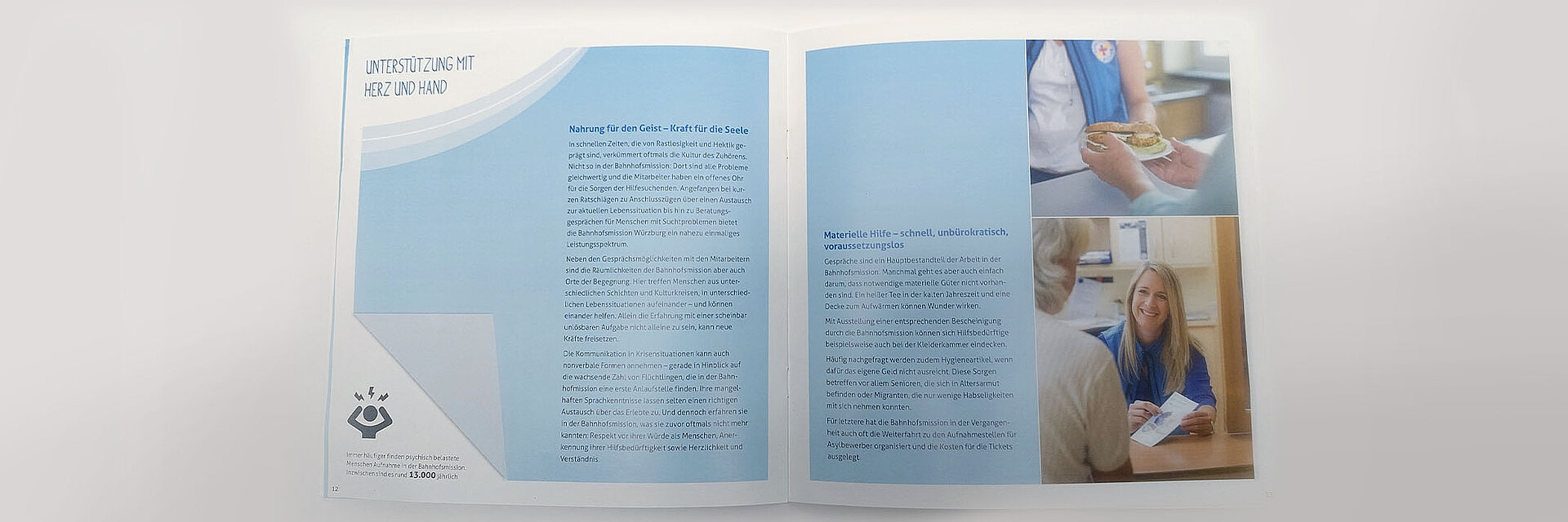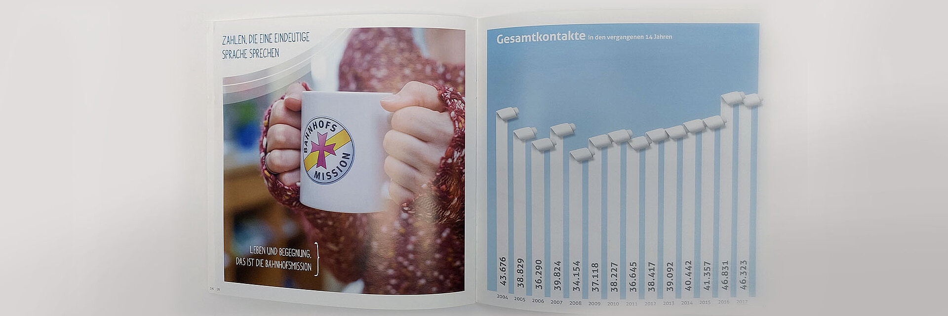 Seit Beginn der vielfältigen Beratung und Unterstützung im Jahr 2012 haben wir viele Projekte begleitet: von konzertierten PR-Maßnahmen zur Förderung von Bekanntheit und Awareness über Branding und konzeptionelle Mitwirkung bei den erfolgreichen Aktionen „Wanderbank“ und „Musik verbindet“ bis zur Gestaltung und Produktion von Imagebroschüre, Flyern, Postern und vielem mehr. Ein Highlight setzten zahlreiche Aktivitäten rund um das 120-jährige Jubiläum der Bahnhofsmission im Jahr 2018, die wir konzipiert, gestaltet und realisiert haben. Im Lauf der Jahre wurde der Internet-Auftritt ebenso von uns begleitet wie die Initialisierung der Social-Media-Kanäle und ihr kontinuierliches Feeding mit aktuellen Kampagnen und Postings.