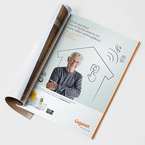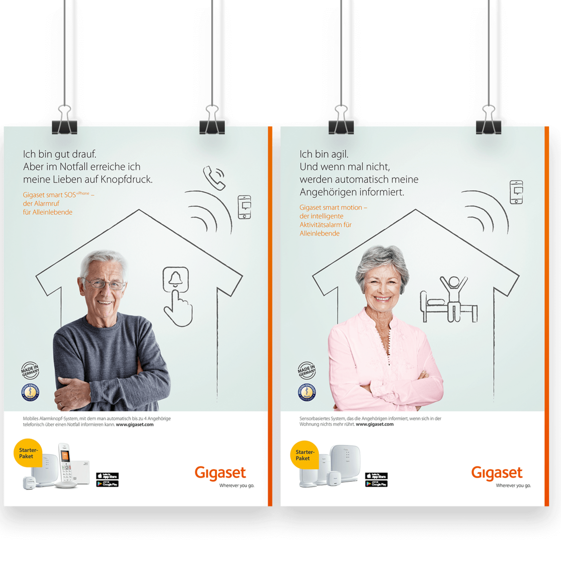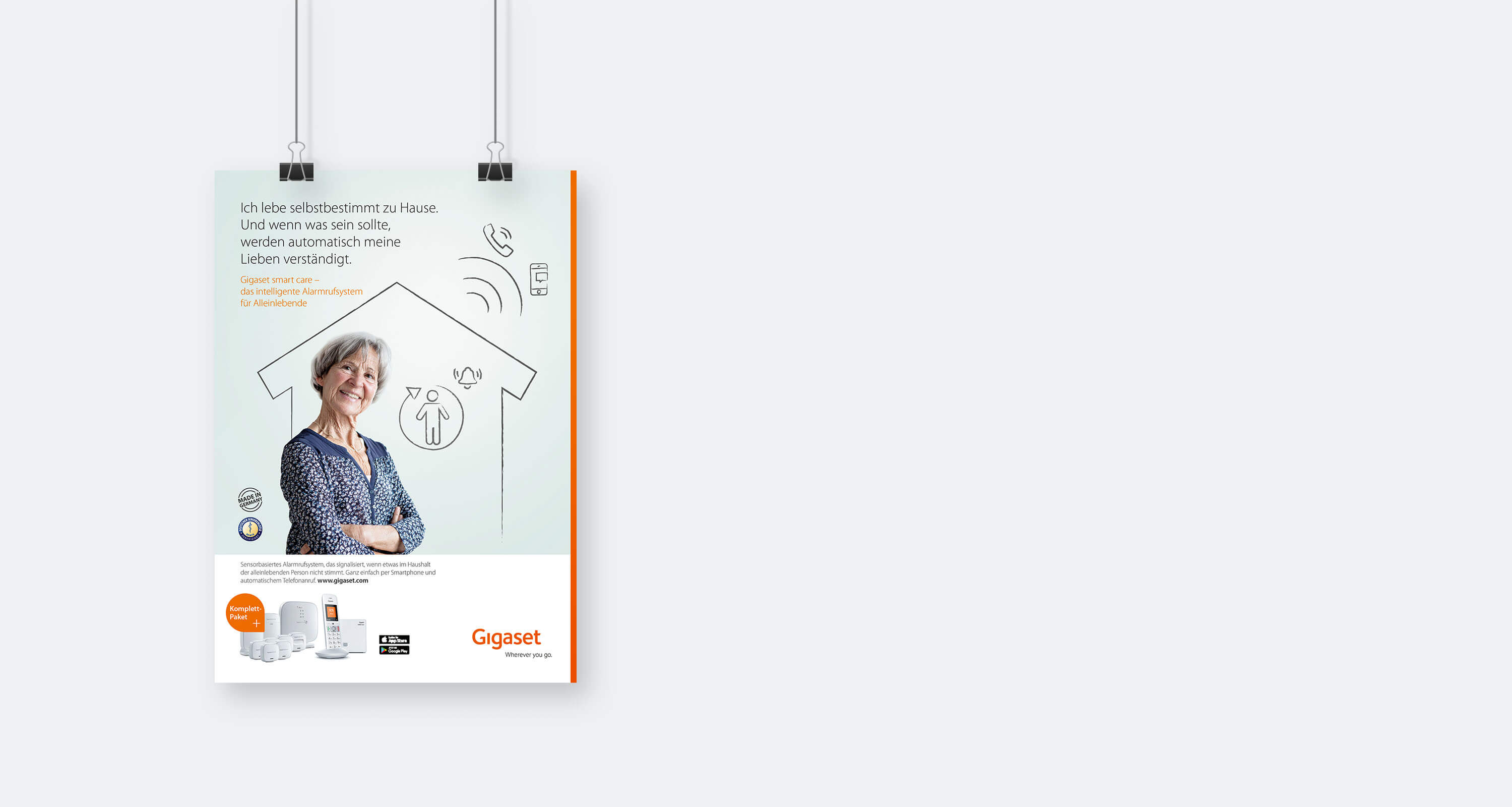 Die Smart Care Lösung von Gigaset ermöglicht älteren Menschen und ihren Angehörigen mehr Lebensqualität. Denn sie gibt Sicherheit für den Fall der Fälle. Schnell und zuverlässig können ältere Menschen Hilfe anfordern oder Angehörige werden über Unregelmäßigkeiten per App informiert. Unsere Kampagnenidee bringt den Nutzen auf den Punkt und wird in allen digitalen und analogen Kanälen platziert.