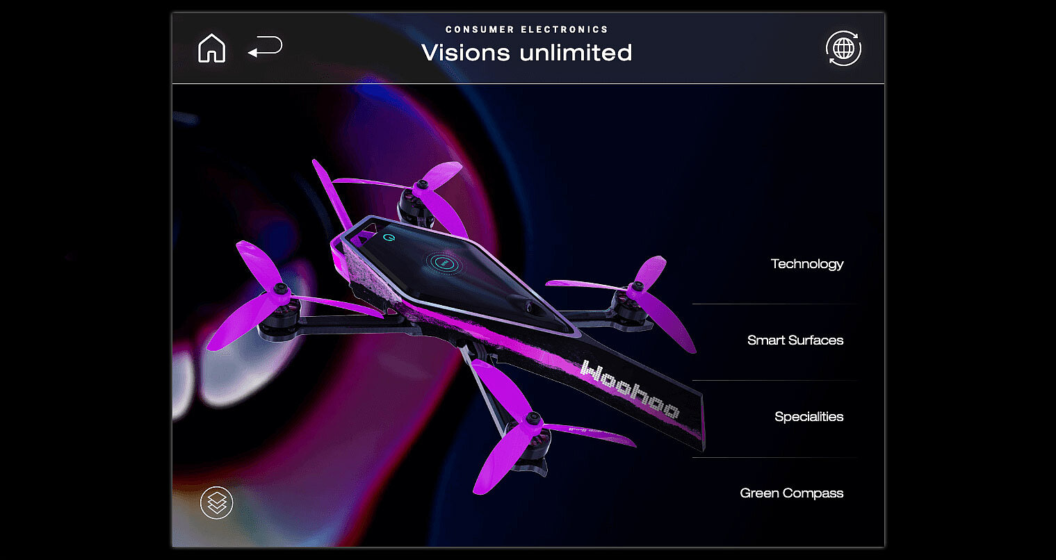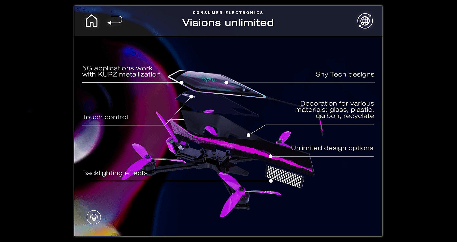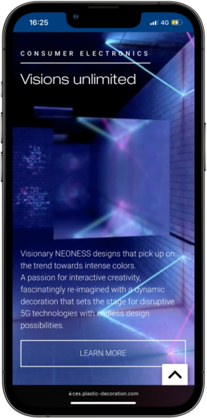Unter dem Motto „Mission (In)Visible“ konzipierten wir einen Online-Auftritt, der sich perfekt in die Cl von KURZ einfügt und gleichzeitig den kreativen und technologischen Charakter der CES auffängt. Das Design bildete die inhaltliche und visuelle Klammer der gesamten Messepräsenz: User, die die Website besucht hatten, konnten sich sofort auf dem KURZ Stand orientieren. Mitarbeitende auf dem Stand profitierten von iPads in der gleichen Design-Welt, die klar strukturierte und visuelle Inhalte zur Kundeninformation boten.