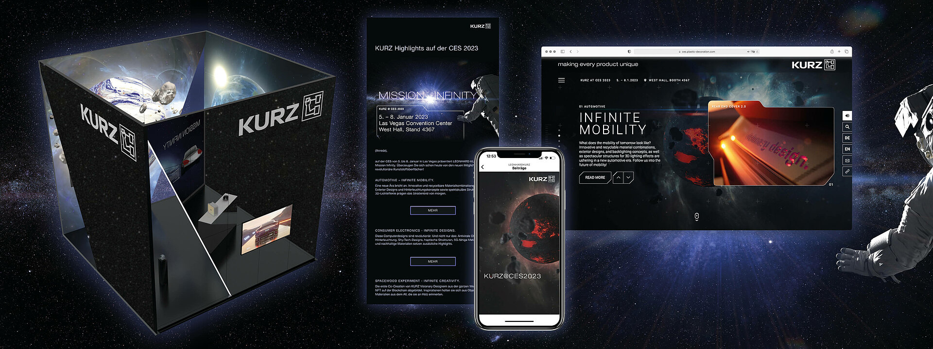 Die Brand Awareness in den USA sollte gesteigert werden. Die Zielgruppe soll verstehen, was KURZ macht: Kunststoffoberflächen für Automotive, CE und weitere Branchen, verknüpft mit innovativen Lösungen wie digitaler Produktpass und NFT, Sensortechnologie, Hinterleuchtung, Shy Tech Design etc. Dazu entwickelten wir ein innovatives Designkonzept, das auf dem ersten weltweiten Designprojekt von KURZ basierte. Ausgewählte Designer auf der ganzen Welt bekamen folgende Aufgabe: „Beamt Euch ins Weltall und bringt Gegenstände mit, die Euch irgendwie an Holz erinnern. Entwickelt daraus in Co- Creation Design-Visionen.“ Die Ideen, die daraus entstanden sind, bildeten die Grundlage für das umfassende Konzept: Mission Infinity. Sie zogen sich wie ein roter Faden durch sämtliche Maßnahmen: Ad Kampagnen, Landingpages, Mailings, Standkonzept und Kreation sowie Social Media.