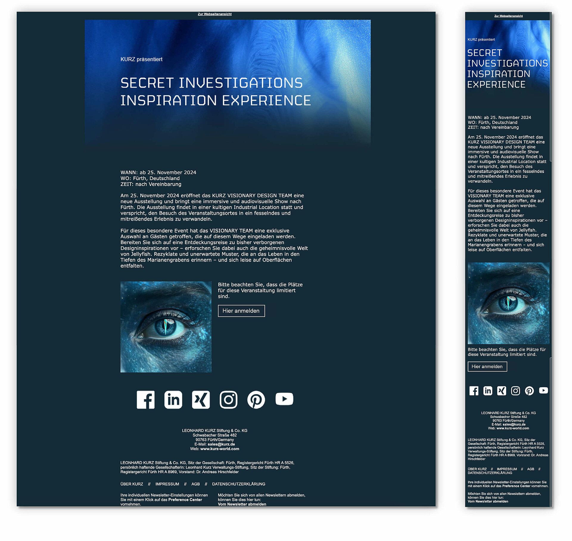 Doch auch wer an Tiefenangst leidet, kam später auf seine Kosten: Die Landingpage fungierte als Einladung zur exklusiven Visionary Design-Ausstellung im Unternehmenssitz Fürth – 294 Meter über NHN.