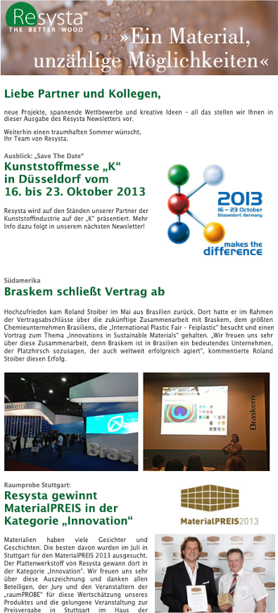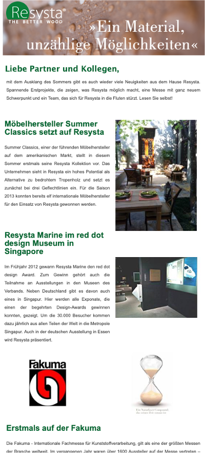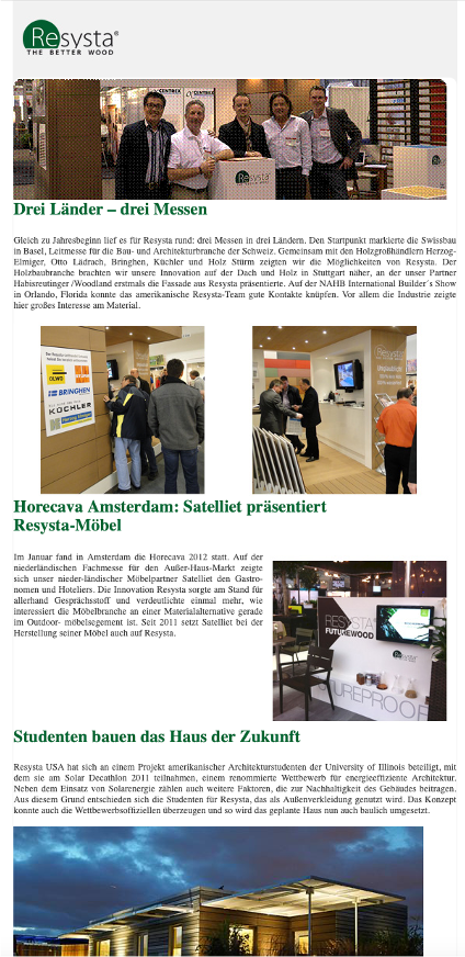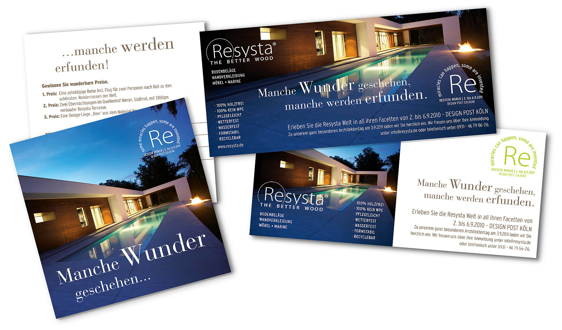 Unsere Aufgabe war es, die Marke Resysta durchsetzungsstark in den Köpfen der Zielgruppen – Architekten, Planer, Projektentwickler, Handelspartner und Investoren – zu verankern. Unsere Leistungen: Presse- und Öffentlichkeitsarbeit, Content-Entwicklung sowie die Organisation und Durchführung von Veranstaltungen. Noch im Jahr der Markteinführung wurde Resysta mit zahlreichen Preisen ausgezeichnet.