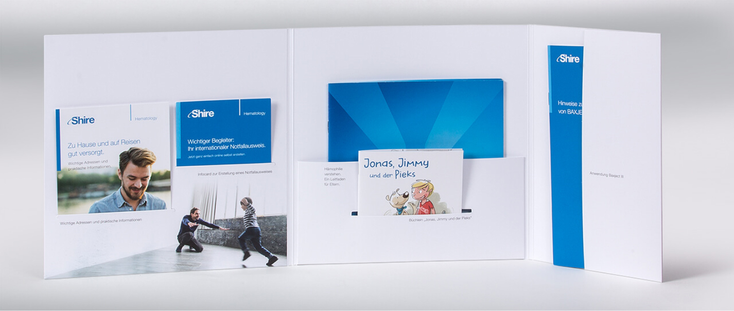 Unter dem Motto „Alles griffbereit“ und „Alles drin“ entwickelten wir für Hämophilie-Patienten Rundum-Sets zur Anwendung der Präparate von Shire.