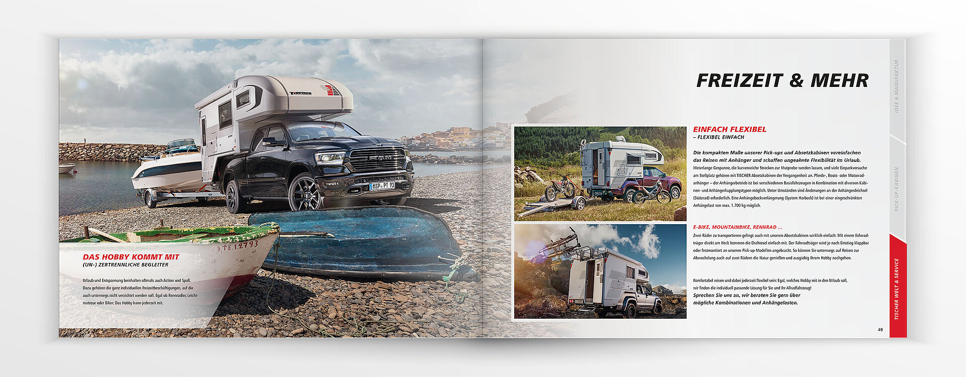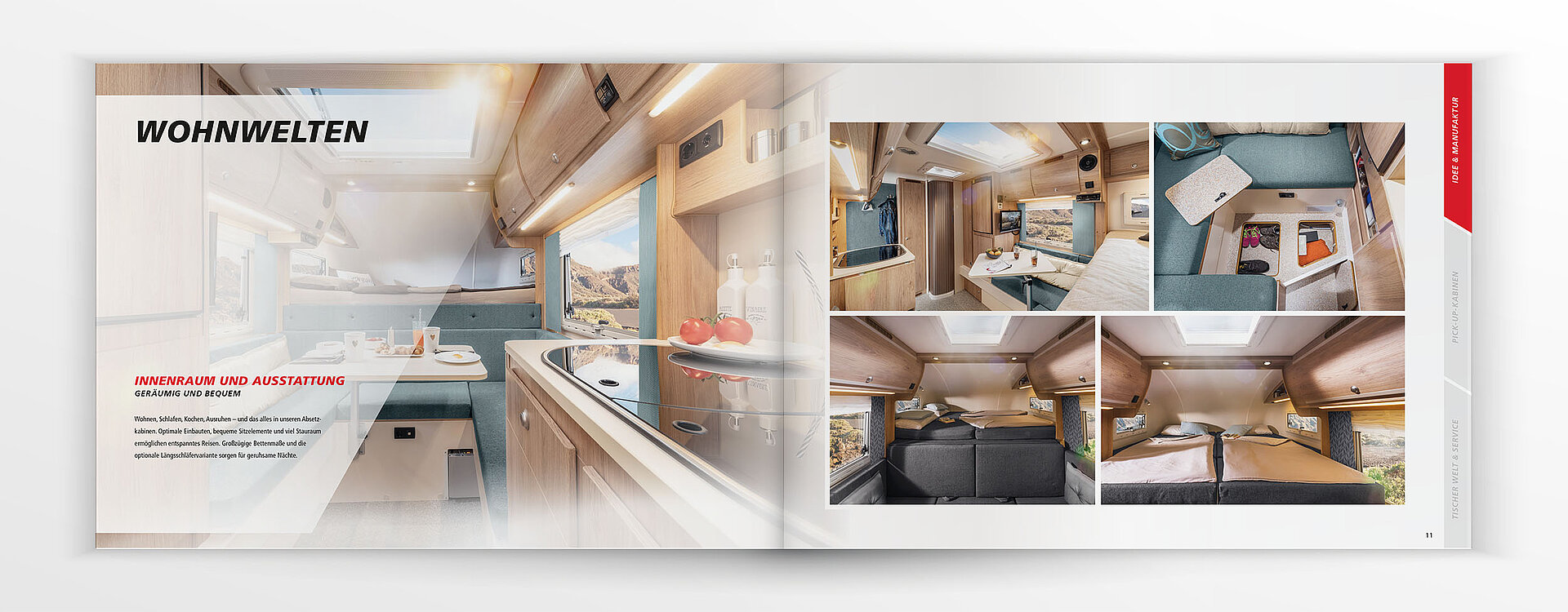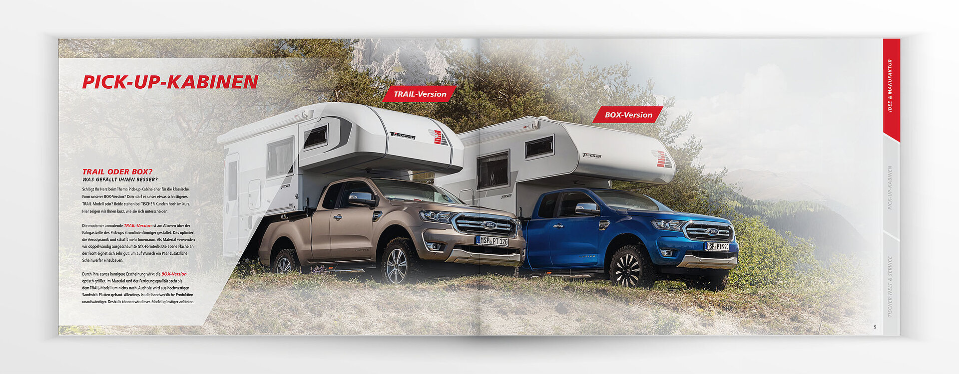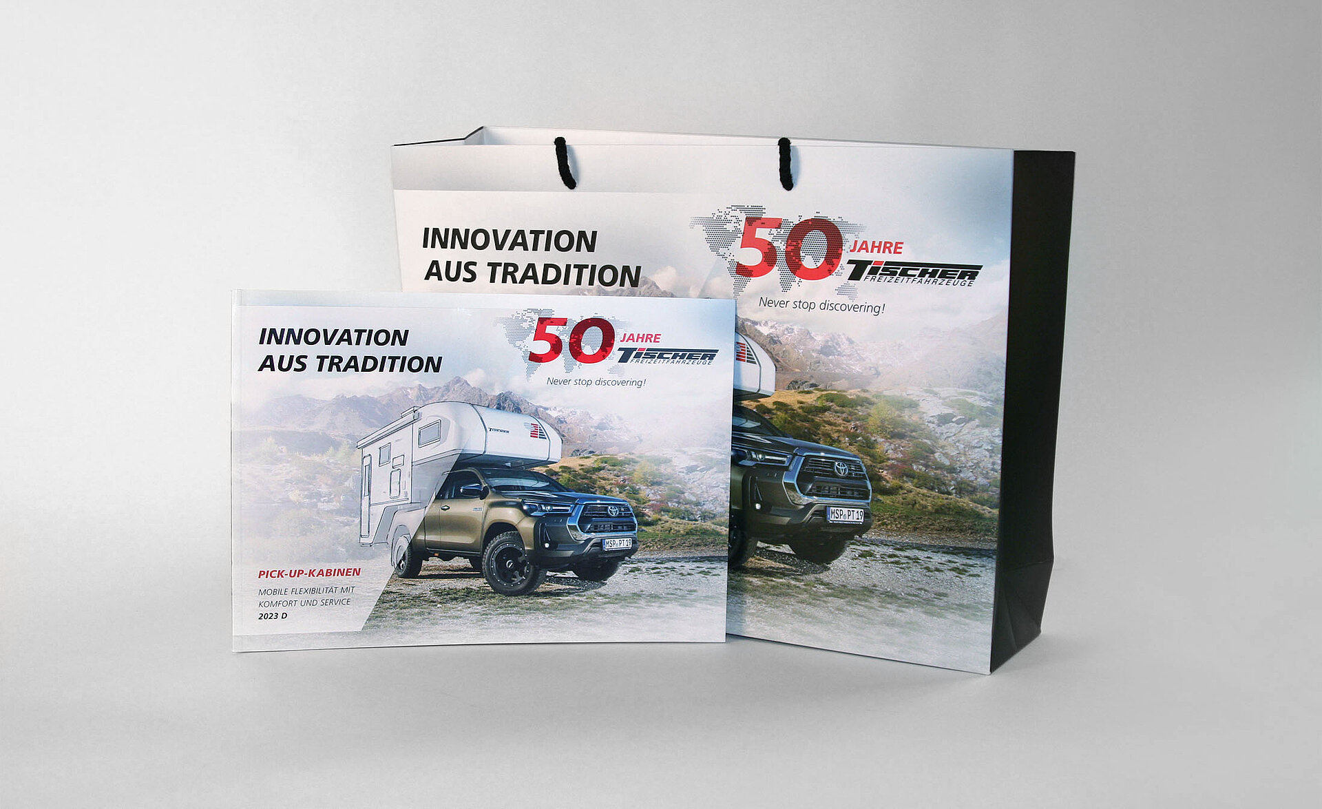Freiheit mit Outdoor- und Offroad-Feeling – dafür steht Tischer Freizeitfahrzeuge. Dieses Freiheitsgefühl und die Vorteile einer Urlaubsform, die zunehmend beliebter wird, zu transportieren, ist Ziel der crossmedialen Kommunikation. Ein Hauptaugenmerk dabei liegt auf der emotionalen Inszenierung der Symbiose aus Pick-up und Absetzkabine. Aber auch die umfassende Darstellung technischer Daten und Details zum Fahrzeughandling finden Eingang in die Kommunikation. Die stetig wachsende Tischer-Community wird über regelmäßige Social-Media-Beiträge, aufmerksamkeitsstarke Messeauftritte und begeisternde Rallyes von der Marke überzeugt und in das Unternehmen eingebunden.