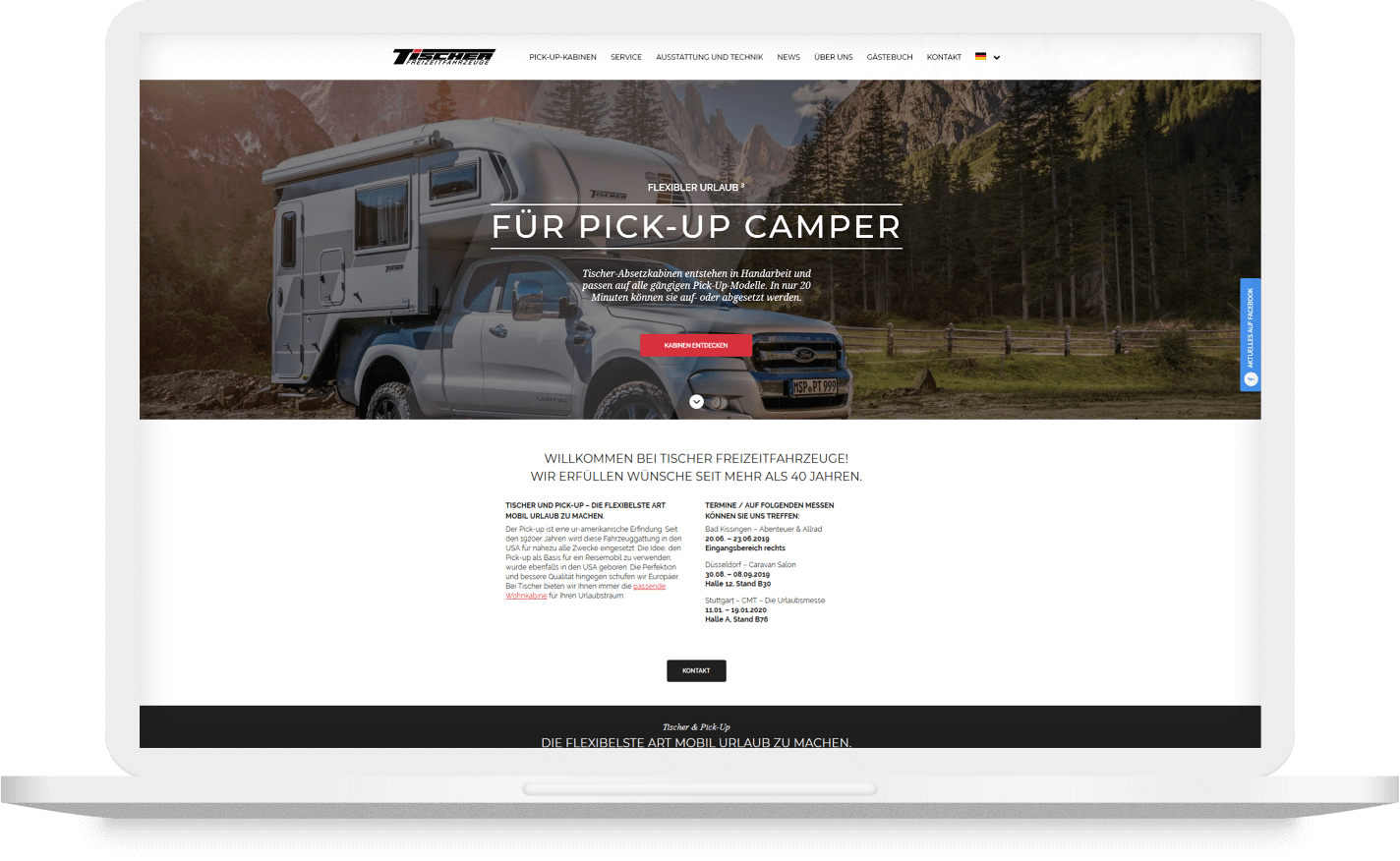 Für Tischer Freizeitfahrzeuge erfolgten ein Website-Relaunch, ein SEO-Konzept sowie verschiedene Social-Media-Kampagnen und die Gestaltung der Facebook-Seite. Auch im Printbereich erfolgten diverse Anzeigen und Banner.