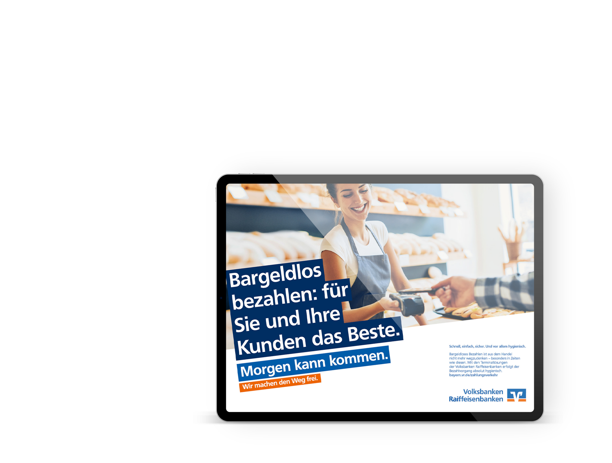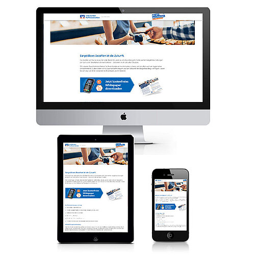 Begleitet wurden die Maßnahmen durch umfangreiche Online-Aktivitäten. Neben einer entsprechenden Landingpage zum Thema „bargeldloser Zahlungsverkehr“ wurde eine begleitende Bannerkampagne geschaltet, die die Interessenten über einen CTA zu weiterführendem Content wie einem Whitepaper leitete. Um das Thema „bargeldloser Zahlungsverkehr“ auch audiovisuell in den Medien zu platzieren, wurde neben einem 20-sekündigen Werbespot auch ein Hörfunk-Spot entwickelt und in den zielgruppenrelevanten Sendern geschaltet.