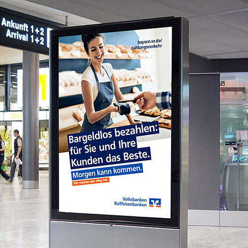 Im ersten Schritt galt es eine kreative Leitidee für die Firmenkundenkampagne im neuen Markenauftritt der Volksbanken Raiffeisenbanken zu entwickeln. Im zweiten Schritt wurde darauf aufbauend eine crossmediale B2B-Kampagne für die Entscheider der Handelsunternehmen gelauncht. Zum Einsatz kamen dabei neben den klassischen Medien spezielle Out-of-Home-Platzierungen an Flughäfen sowie POS-Aktivitäten in den lokalen Volksbanken und Raiffeisenbanken Filialen.