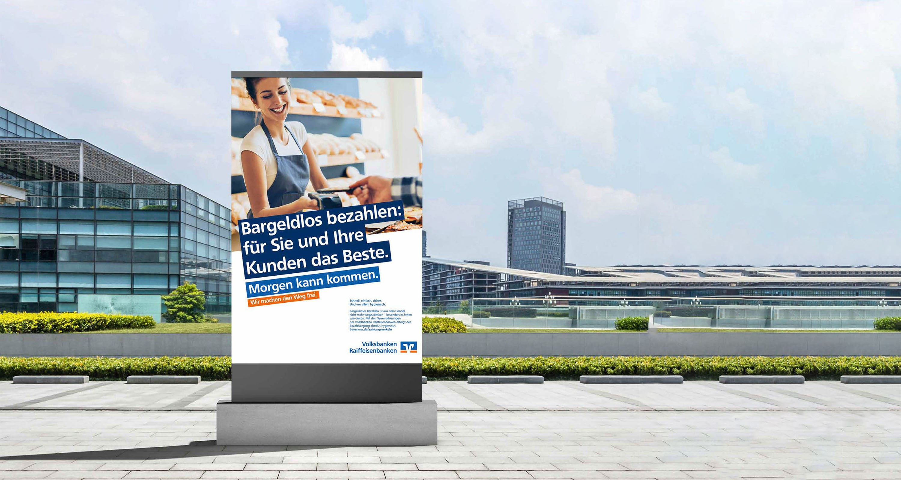Brand, Analog, DigitalFür den neuen Markenauftritt der Volksbanken und Raiffeisenbanken „Morgen kann kommen“ entwickelte kl,company eine B2B-Firmenkunden-Kampagne. Das aktuelle Thema: bargeldloser Zahlungsverkehr. Ob im Supermarkt, Friseursalon oder Modegeschäft – das Interesse, im Einzelhandel mit der Karte oder dem Smartphone zu bezahlen, ist stark gestiegen.