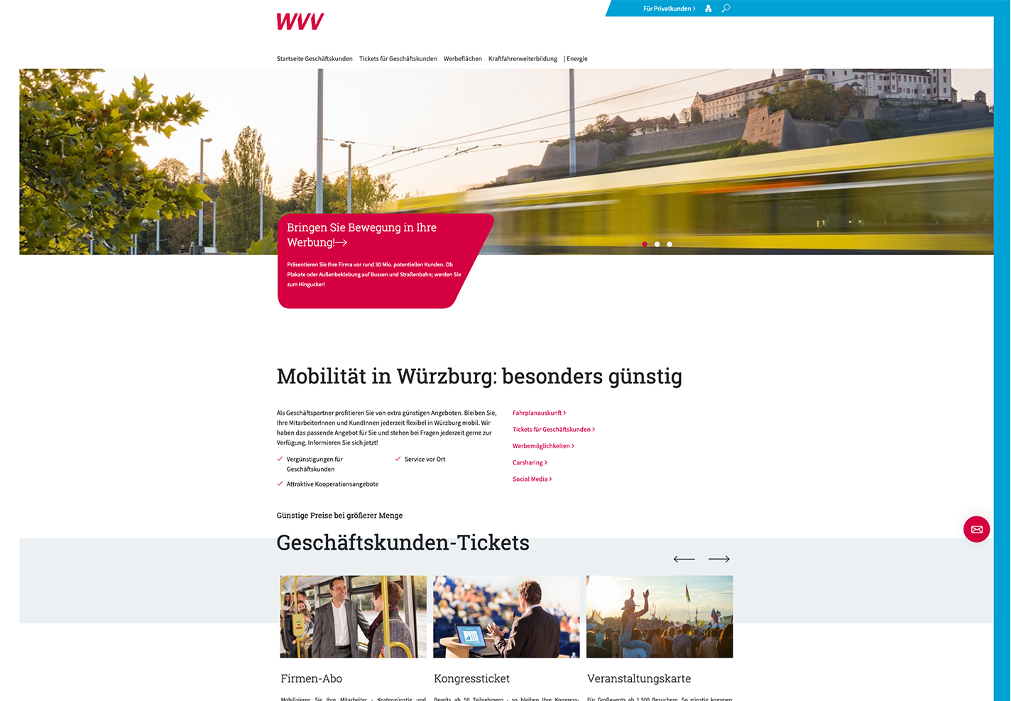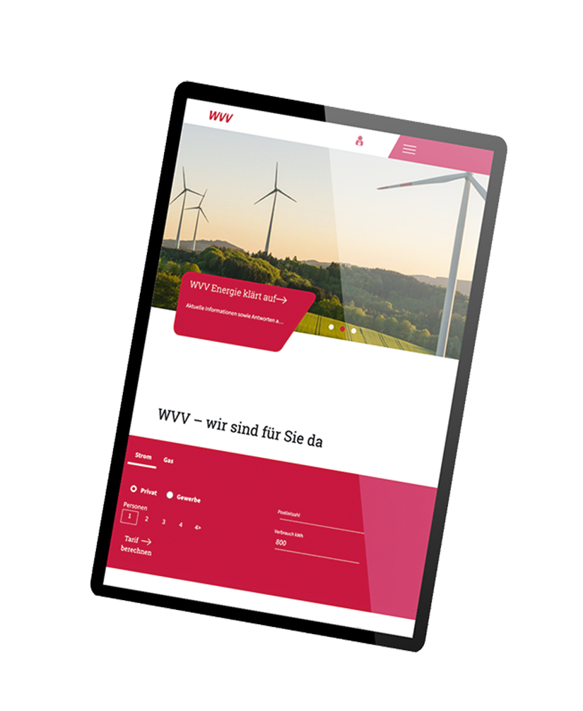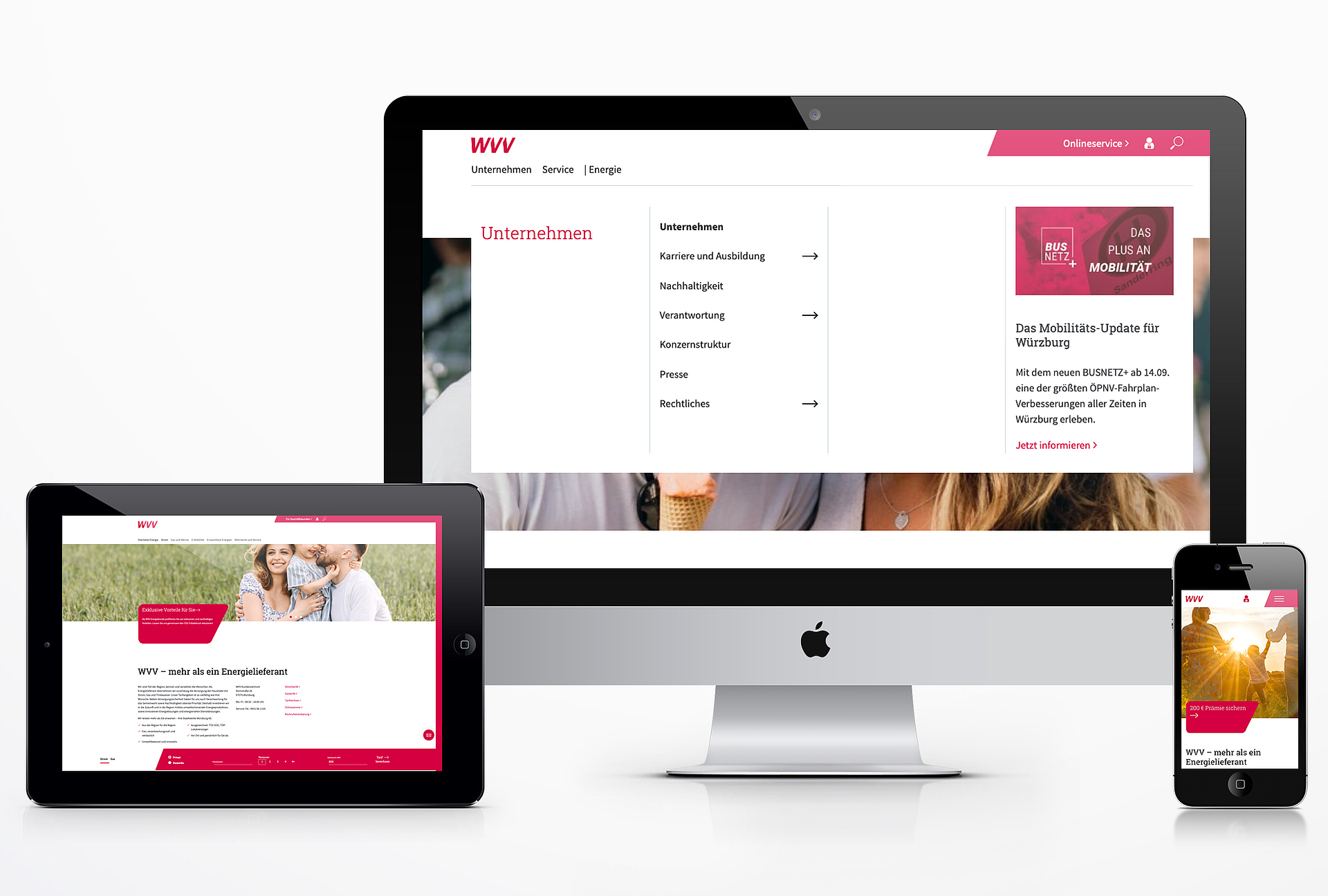 Strom, Gas, Wasser und Mobilität – dafür steht die Würzburger Versorgungs- und Verkehrs-GmbH (WVV) seit über 50 Jahren. So zukunftsorientiert wie das Unternehmen sollte auch dessen Außenauftritt sein. Eine besondere Herausforderung – denn unter dem Markendach der WVV galt es acht sehr unterschiedliche Unternehmensbereiche mit ihren Bedürfnissen zu repräsentieren: Nahverkehr, Energie, Parkraum, Bäder, Kompostwerk, Hafen, Immobilien und Trinkwasser. Zudem mussten anspruchsvolle Schnittstellen zu den unterschiedlichen Unternehmensbereichen wie Online-Ticket, Tarifrechner und Zählerstandsmelder mitberücksichtigt werden.