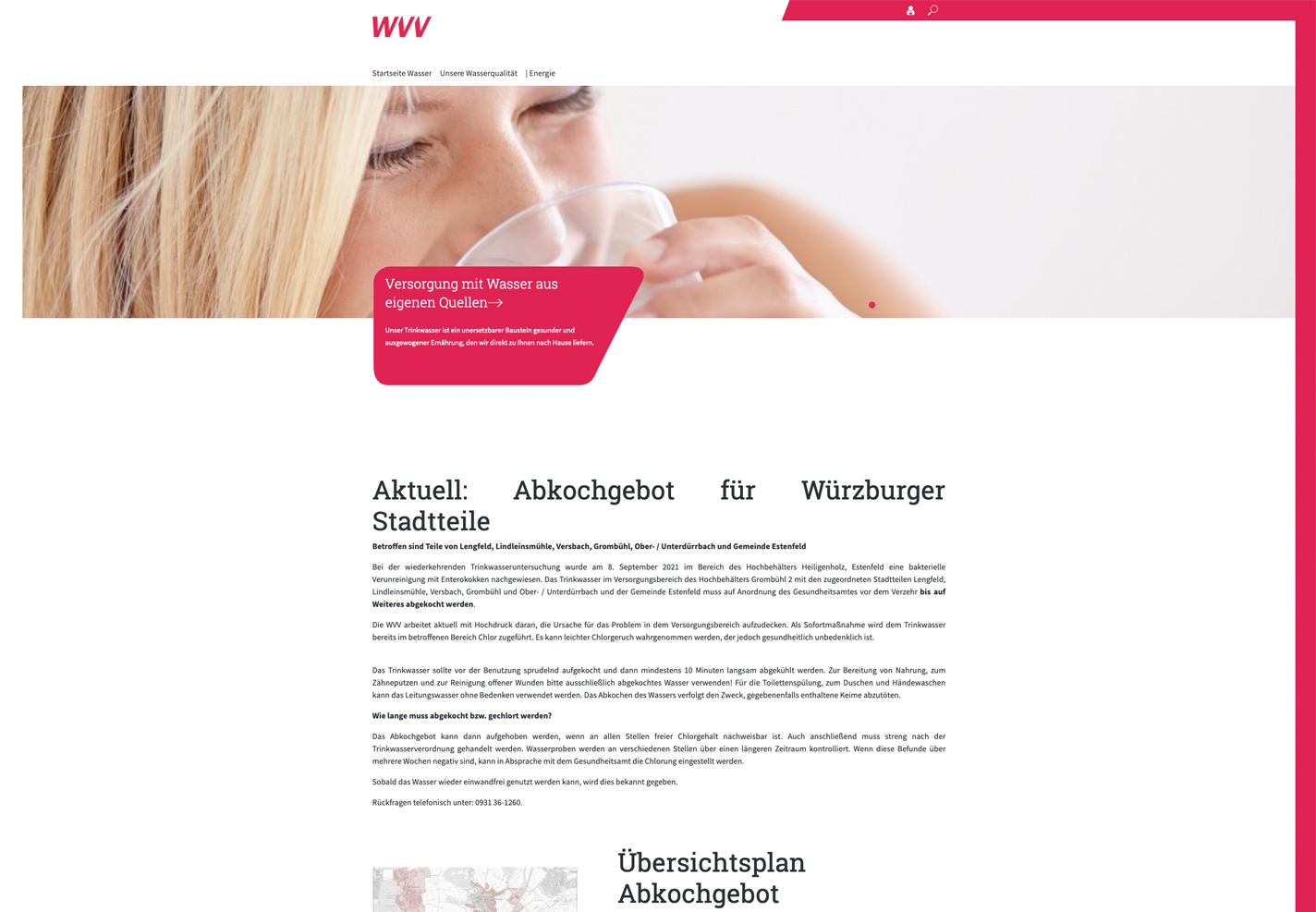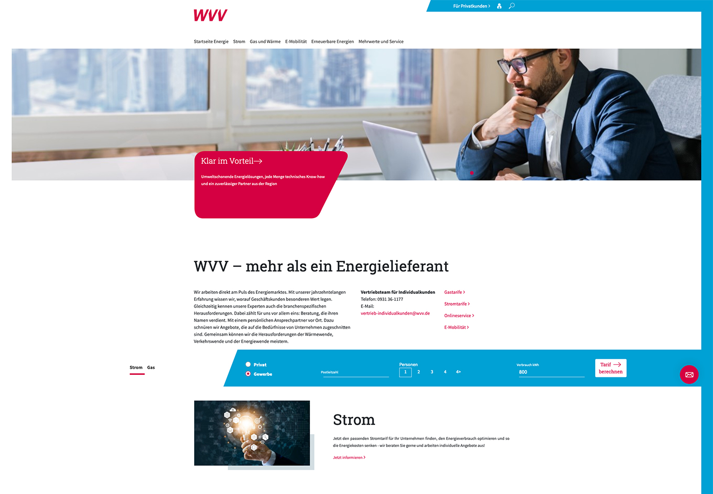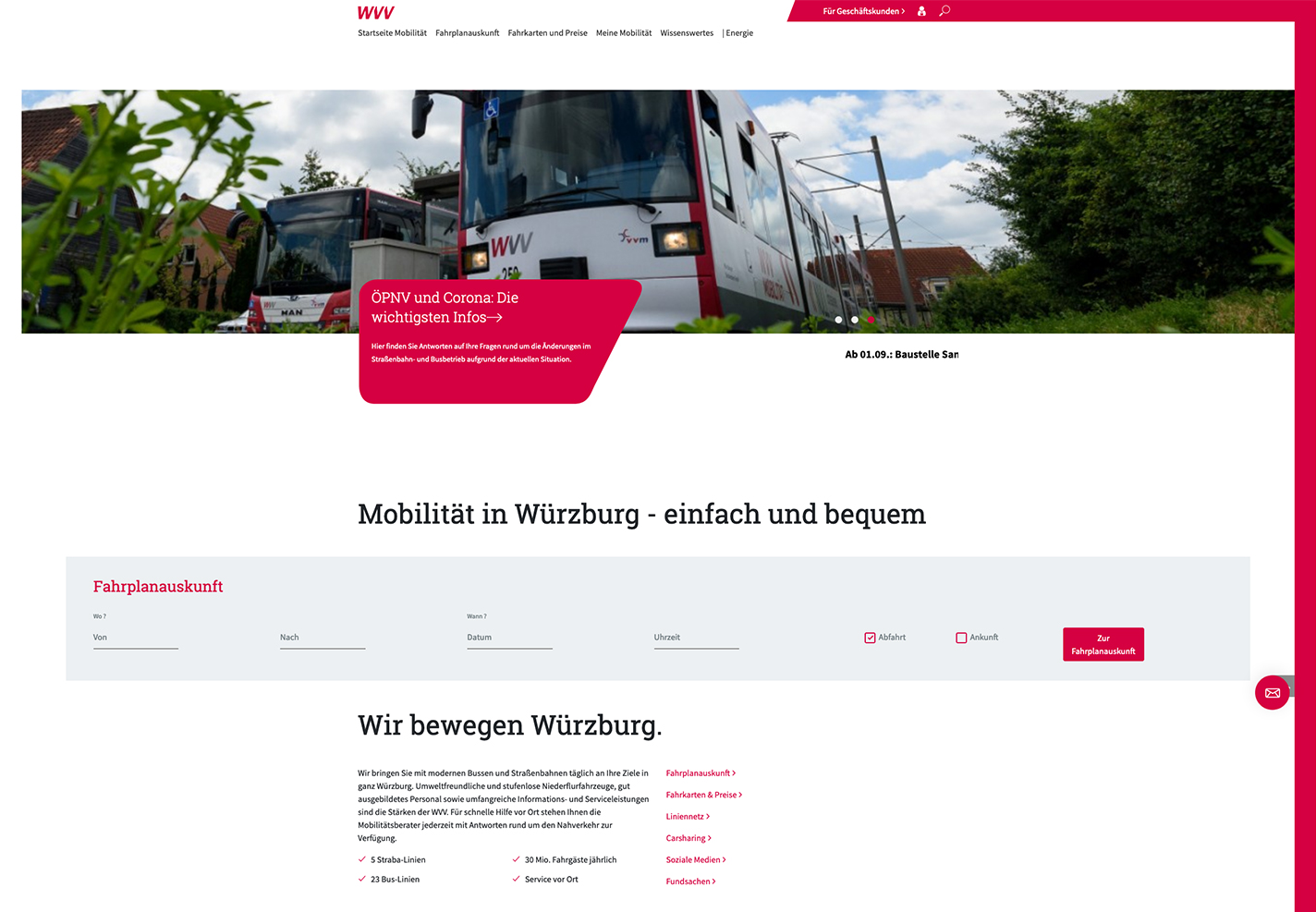 Strom, Gas, Wasser und Mobilität – dafür steht die Würzburger Versorgungs- und Verkehrs-GmbH (WVV) seit über 50 Jahren. So zukunftsorientiert wie das Unternehmen sollte auch dessen Außenauftritt sein. Eine besondere Herausforderung – denn unter dem Markendach der WVV galt es acht sehr unterschiedliche Unternehmensbereiche mit ihren Bedürfnissen zu repräsentieren: Nahverkehr, Energie, Parkraum, Bäder, Kompostwerk, Hafen, Immobilien und Trinkwasser. Zudem mussten anspruchsvolle Schnittstellen zu den unterschiedlichen Unternehmensbereichen wie Online-Ticket, Tarifrechner und Zählerstandsmelder mitberücksichtigt werden.