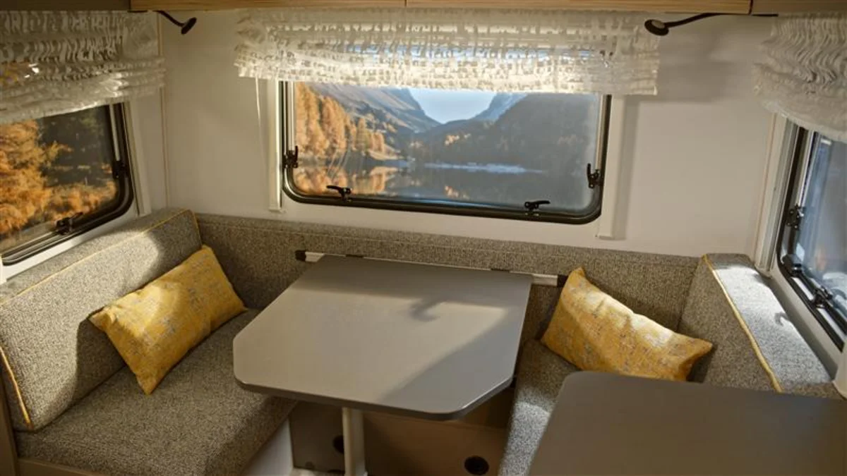 Wohlfühlen und genießen – in der gemütlichen Sitzecke mit herrlicher Aussicht durch drei Fenster und einem Dachfenster für den Blick in den Himmel. LEDs setzen das perfekte Licht, Rollos schützen, die Couch wird im Handumdrehen zum dritten Bett.