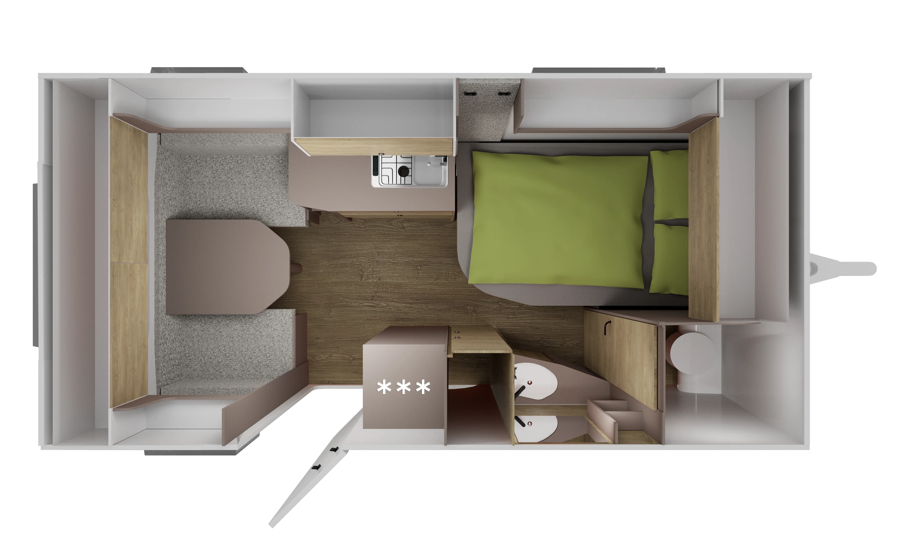 Der kleine Wohnwagen für 2 bis 3 bietet alles für NEXT Generation Camping: Ein stabiles Chassis, gute Isolierung, Frischwassertank mit Außenbefüllung, Heizung, Schlafbereich, eine funktionale Küchenzeile mit Kochfeld und Stauraum sowie ein Waschbereich mit WC.